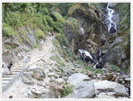 We take a mossy paved path, that snakesthrough a succession of forests and hamlets, giving way, from time to time, to spectacular mountain sceneries. |